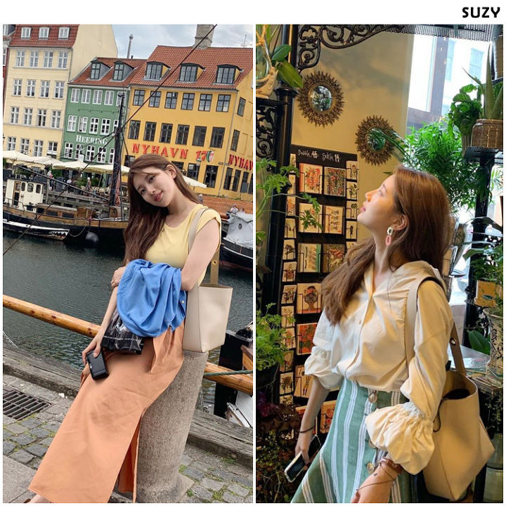 シンプルなイエローTシャツにピッチカラーのスカートをマッチ、パフ袖シャツに非対称ヘムラインスカートをマッチさせた後、ショッパーバックを加えると、デイリールックとしても最適(゚∀゚)