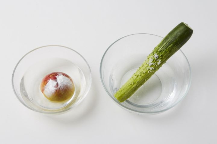 桃は重曹でこすって皮をきれいに洗って、キュウリは塩で皮をこすりきれいに洗う