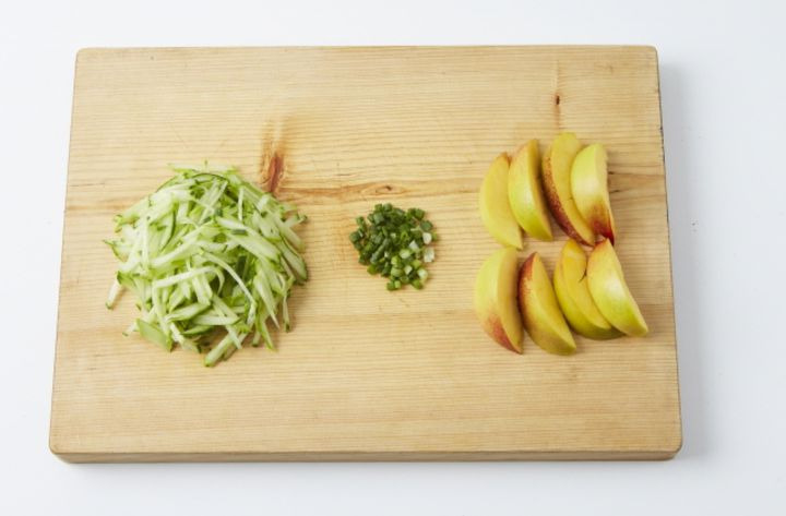 キュウリは、薄く千切り、ねぎはみじん切り、桃は半分に切って種を除去した後、半月形の一口サイズに切る