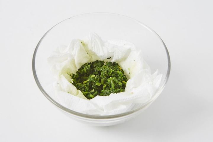 茹でたほうれん草は茎は切り取り、葉だけ細かく切って綿布で水気を絞る。