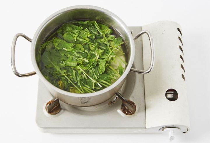 ほうれん草は根を切って沸騰した塩水(水5カップ+塩小さじ1)に入れてゆでた後、水気を絞る。
