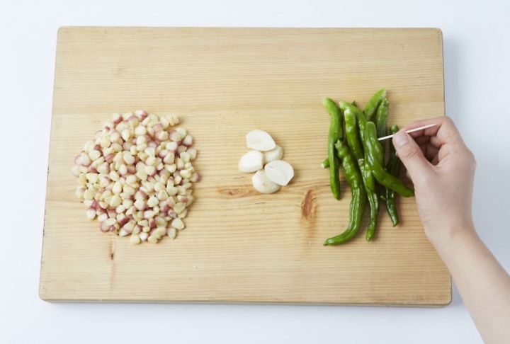 トウモロコシは葉とひげを離した後、中身だけ分離して、ニンニクは2等分にして、唐辛子は串に刺し穴を作る。