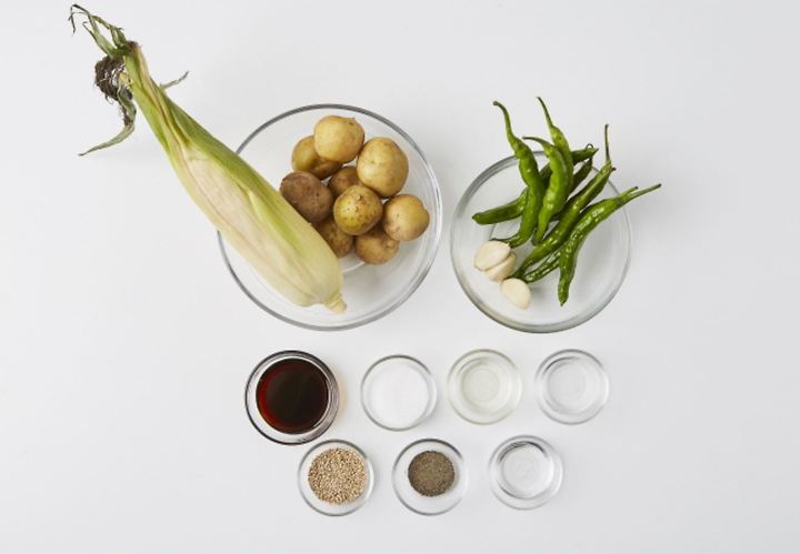 主材料:とうもろこし(1本)、唐辛子(80g)、ニンニク(3粒)、ジャガイモ(10個)