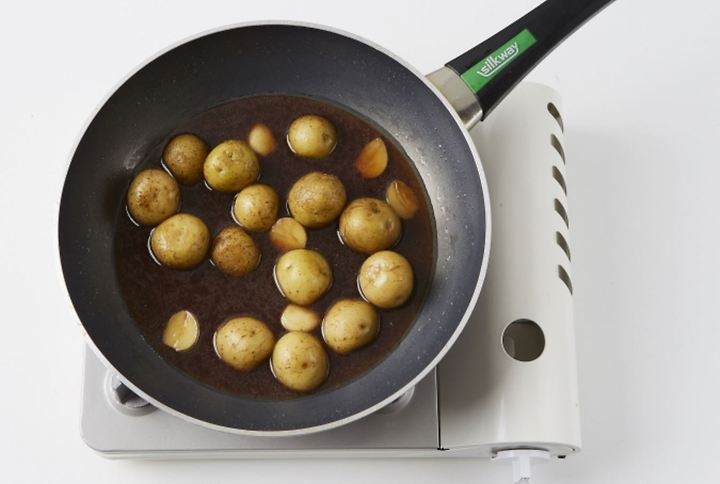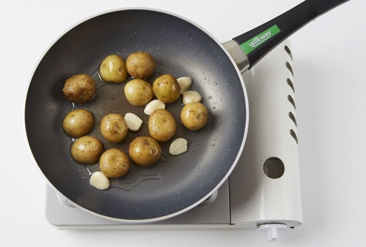 中火に熱したフライパンにサラダ油(大さじ1)をひいた後、ジャガイモとニンニクを入れて2分間炒める。