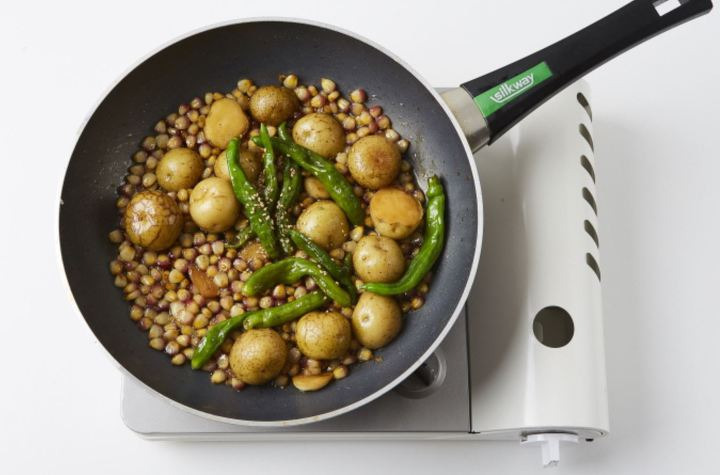ジャガイモに味がついたら唐辛子、水飴、胡椒を入れ、最後にゴマをふりかければ完成☆