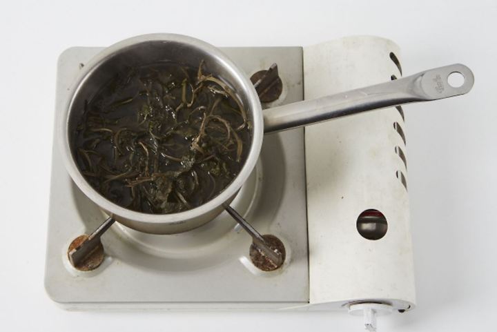 ゴンドレを沸騰したお湯に入れて30分間煮て冷水で洗い、水を切ります。(丈夫な茎が柔らかく切れるまで煮る)