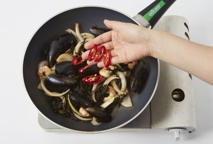 ガンゴレとハーブと赤唐辛子、刻みネギ(大さじ1)、オイスターソース(小さじ1)、水(大さじ3)を入れ、3分間炒めれば完成☆