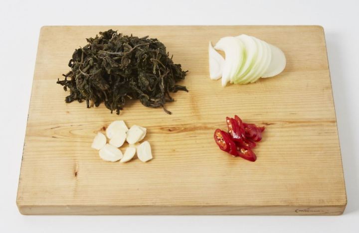 茹でたゴンドレは一口大に切り、タマネギは薄く千切り、赤唐辛子とニンニクは細かく切る。
