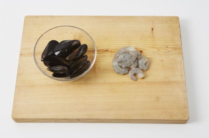 エビは頭と殻を除去し、ムール貝はよく洗って下準備をする。
