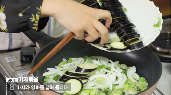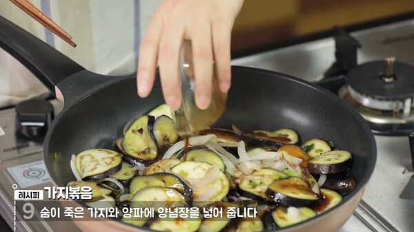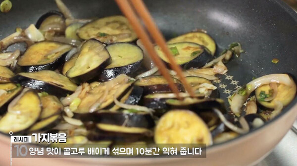 茄子とタマネギがよく炒まればたれを入れて、よく混ぜ合わせ10分間煮ていく。