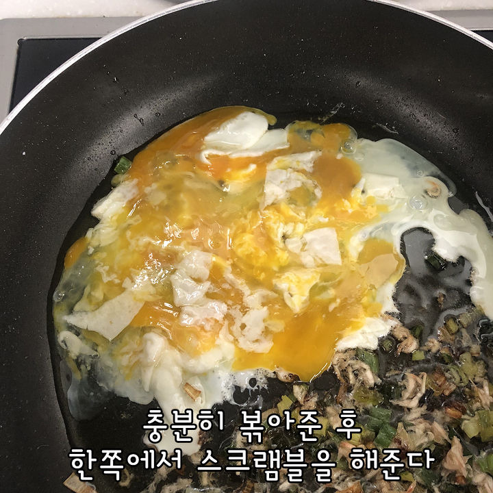 十分に混ぜ合わせたら、卵を入れスクランブルエッグを作るように卵を炒めていく。