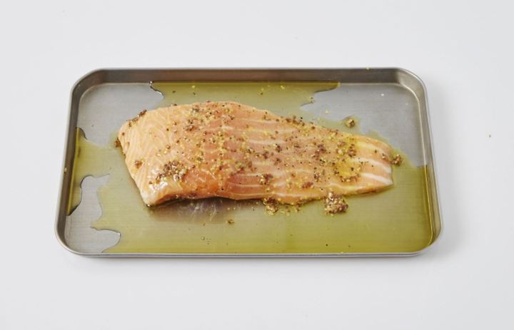 サケはオリーブオイル(大さじ3)、マスタード(小さじ1)、胡椒を振りかけ放置する。
