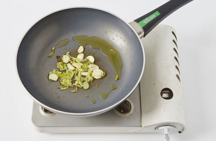 サケを焼いた後、フライパンでオリーブオイル(大さじ2)を入れニンニク、ネギを入れて2分間炒める。