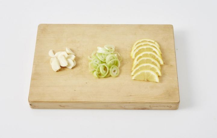ニンニクと長ネギは薄く切り、レモンは半月形に切って準備する。