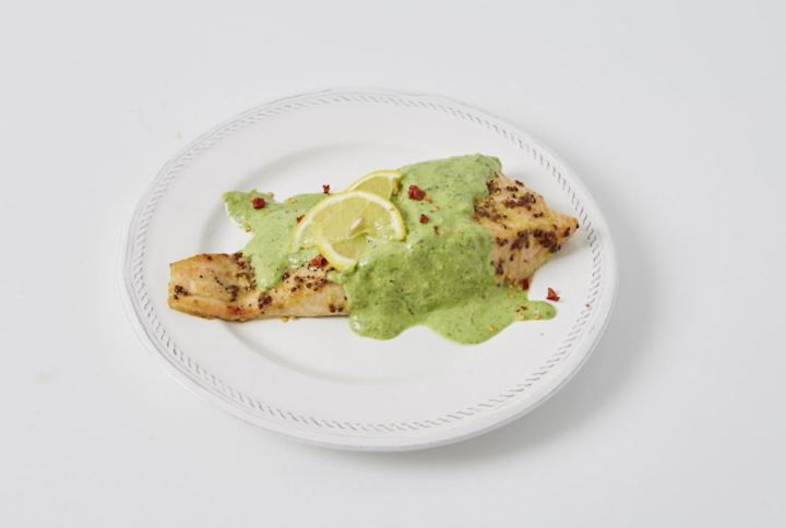 お皿に焼いたサケを盛り、ほうれん草のクリームソースをかけ、唐辛子とレモンを盛りつければ完成☆