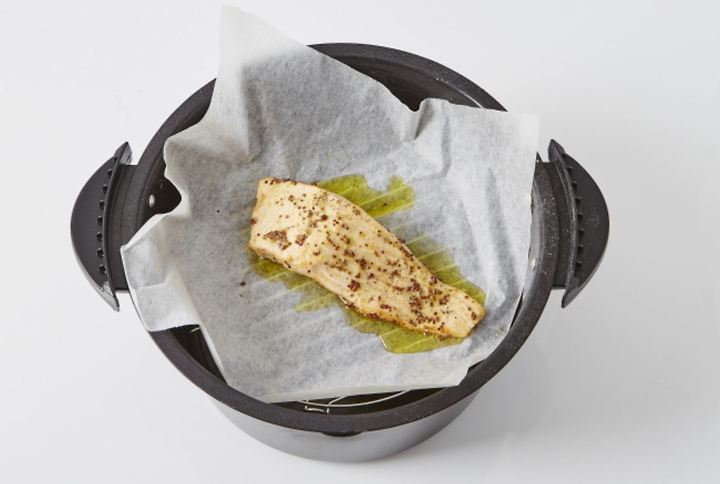 180℃に予熱したエアフライヤーにサーモンを入れて10分間焼いた後、裏返し、5分間焼く。