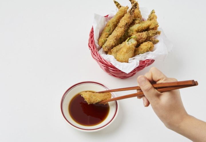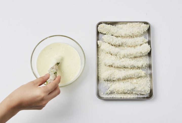 青唐辛子に生地を塗った後、パン粉を厚目にまぶす。