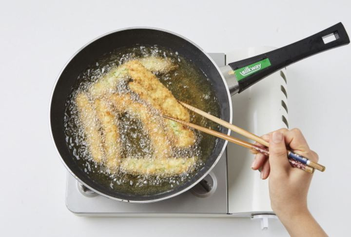 180℃で熱したサラダ油(3カップ)に3分間前後きつね色になるまで揚げる。