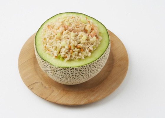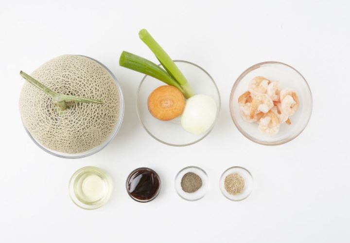 主材料:メロン(1個)、玉ねぎ(半玉)、エビ(10匹)