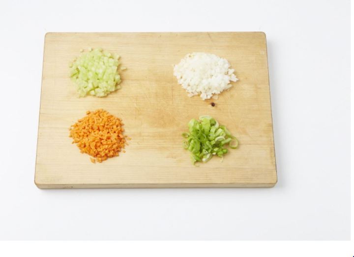 メロンの果肉とタマネギ、ニンジンは細かく切り、長ネギは輪切りにする。