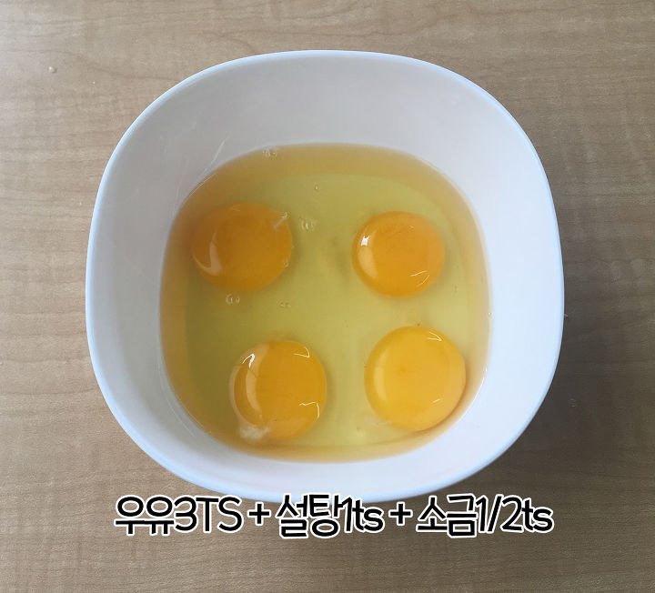 卵4つをボールに割り、牛乳大さじ3杯、砂糖大さじ1杯、塩大さじ2分の1を入れる。