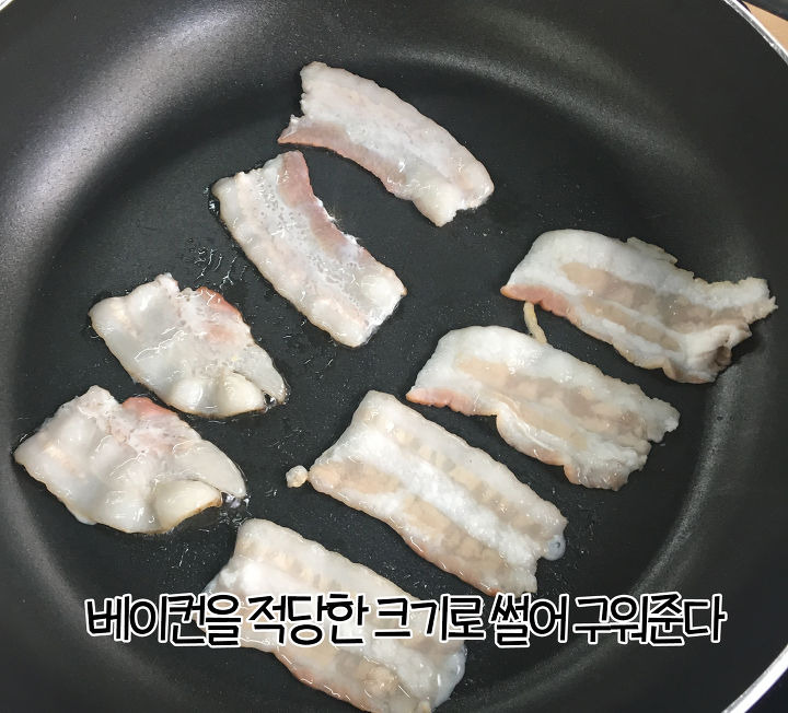 食パンが焼けたら、チーズスクランブルエッグ、ベーコンの順番に乗せる。