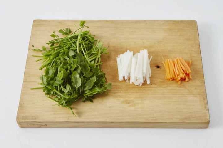 ダシをとっている間に、セリを5㎝の長さに切り、大根、ニンジンも同じ長さに千切りにします。
