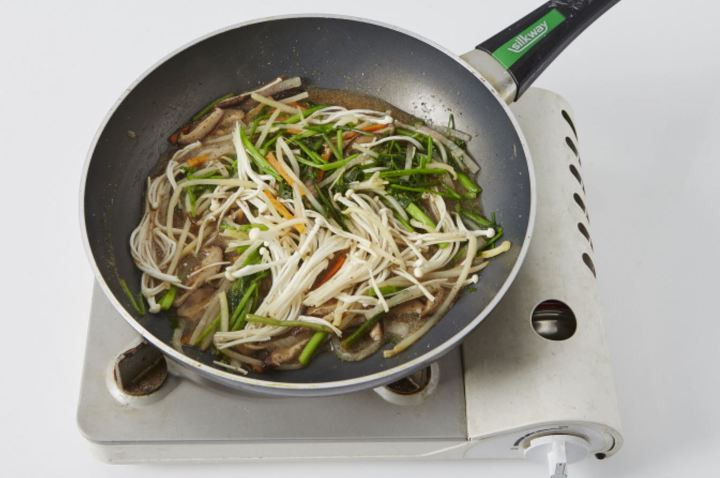 もやしは頭と尾を、えのきは根をそれぞれ除去し、手で裂いて、椎茸は、柱を切って千切りにします。