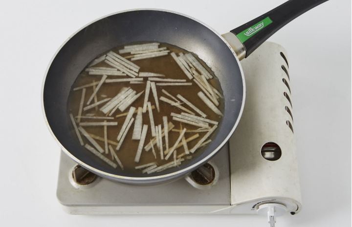 鍋に、昆布、水(2カップ)、醤油(大さじ1)、大根を入れて中火で3分間ゆでる。
