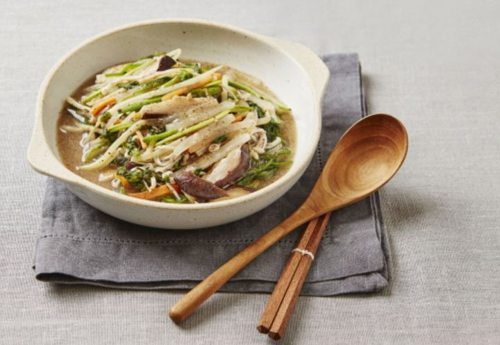 もやし、セリ、エゴマの粉(大さじ2)を入れて2分間沸かした後、でんぷん、水(大さじ2)を入れて混ぜる。