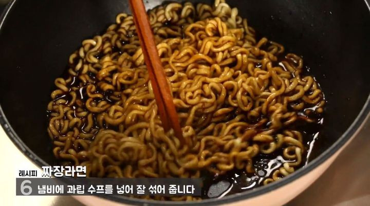 おたまの量の水だけ残した鍋にチャパゲティの粉末スープを入れてよく混ぜる。