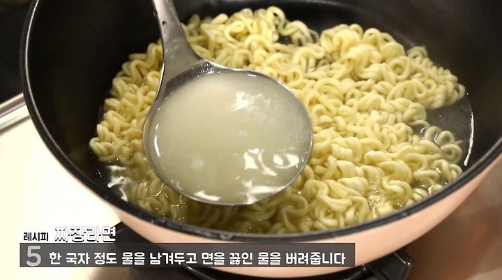 麺が沸騰したら、おたま一杯分の量の水だけを残して、残りは捨てる。