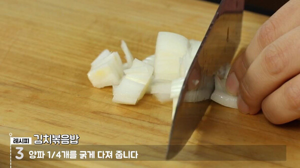 キムチを一口サイズに切り、タマネギは1/4個をみじん切りにする。