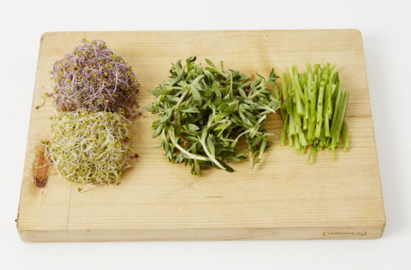 芽野菜は洗って水気を払い落とし、三つ葉の和え物は5㎝の長さに切り、キュウリも5㎝の長さに切る。
