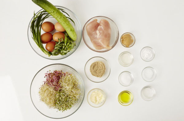 主材料:芽野菜(150g)、きゅうり(1個)、卵(5個)、三つ葉の和え物(30g)
