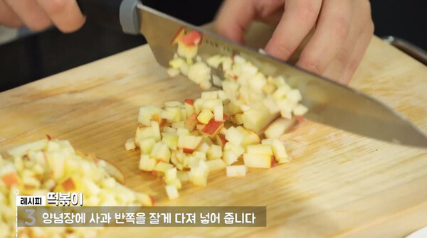 砂糖、唐辛子粉、イワシエキス、醤油、コチュジャンを入れて、リンゴを細かく切って混ぜ合わせます。