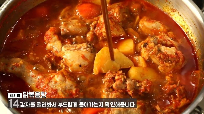 中火で煮た後、ジャガイモに串を刺し、スムーズに刺さるか確かめます。