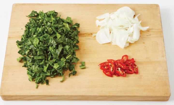 ほうれん草を太めに切り、タマネギは千切りにし、赤唐辛子は適度な大きさに切る。