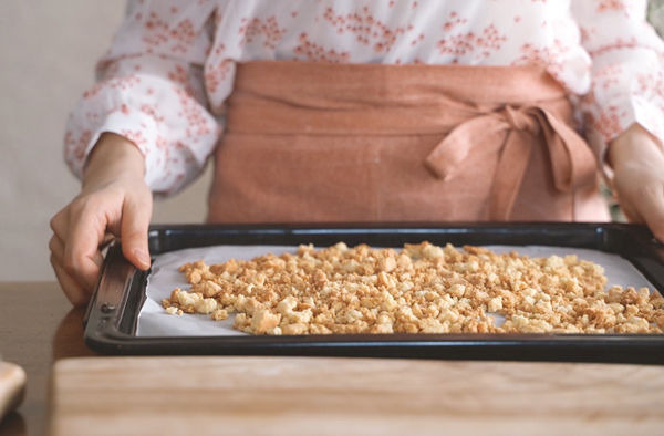 先ほど混ぜ合わせた材料を、ジップロックに入れて1時間の間冷蔵した後、取り出してオーブントレイに広げ、170度に予熱したオーブンで15分間焼く。