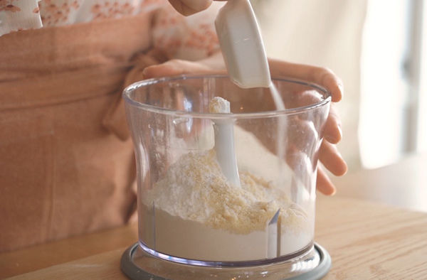 薄力粉120g、アーモンドパウダー30g、ベーキングパウダー2g、砂糖50gを入れ、軽く混ぜた後、バター42g、卵25g、バニラエッセンス2gを入れて再びに混ぜる。