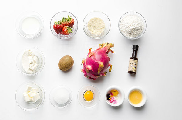 ドラゴンフルーツ1個、いちご4個、キウイ1個、ラズベリー5個、食用花1〜2個、薄力粉120g、アーモンドパウダー30g、ベーキングパウダー2g、砂糖50g、塩少々 、バター42g、卵25g、バニラエッセンス2g、卵黄1個、砂糖20g、バニラエッセンス2g、マスカルポーネクリームチーズ100g、生クリーム40g