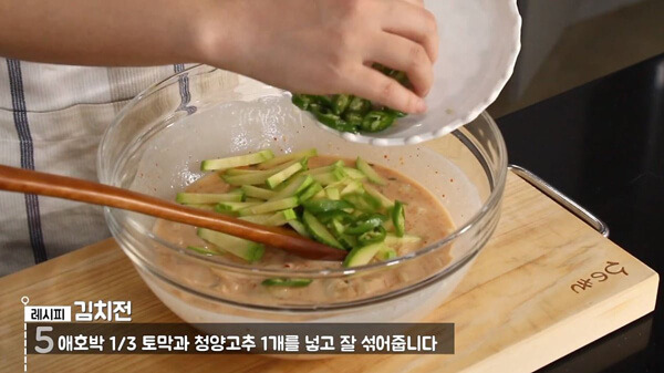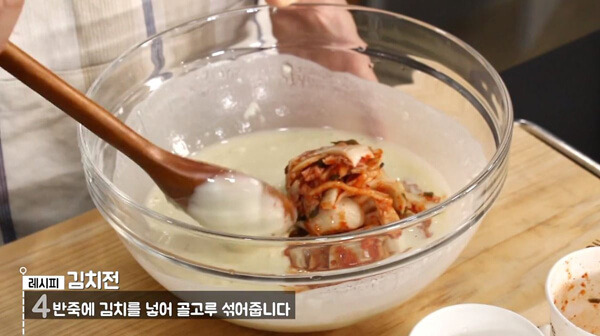 粉をよく混ぜた後、さっき切ったキムチ2カップを入れてよく混ぜる。