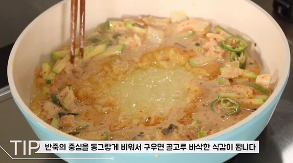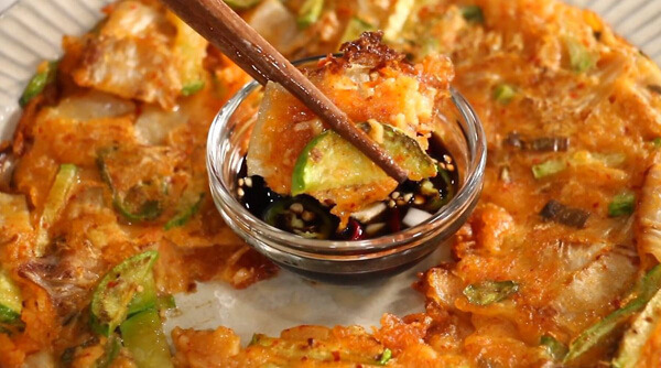 このように焼くと油が染みこむ面積が広くなってまんべんなくサクサクキムチチヂミを作ることができる。