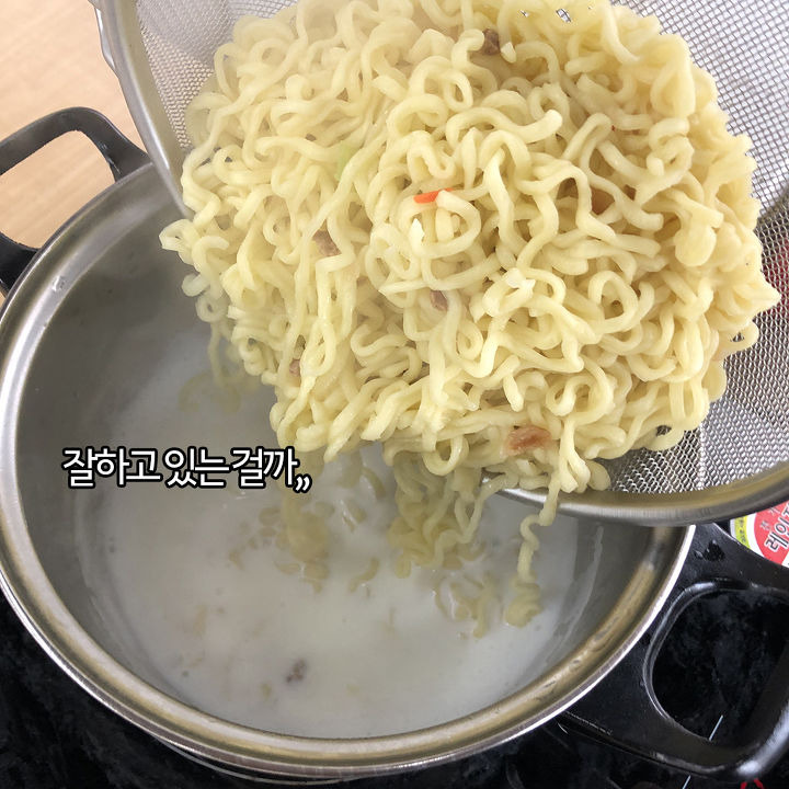 牛乳が沸騰すると麺と粉を一度に入れます。