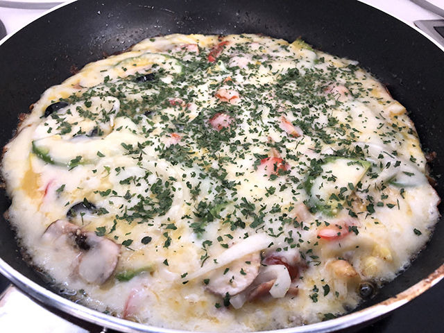 最後に、モッツァレラチーズを散らした後、蓋をしてチーズが溶けるまで少し待てば完成☆