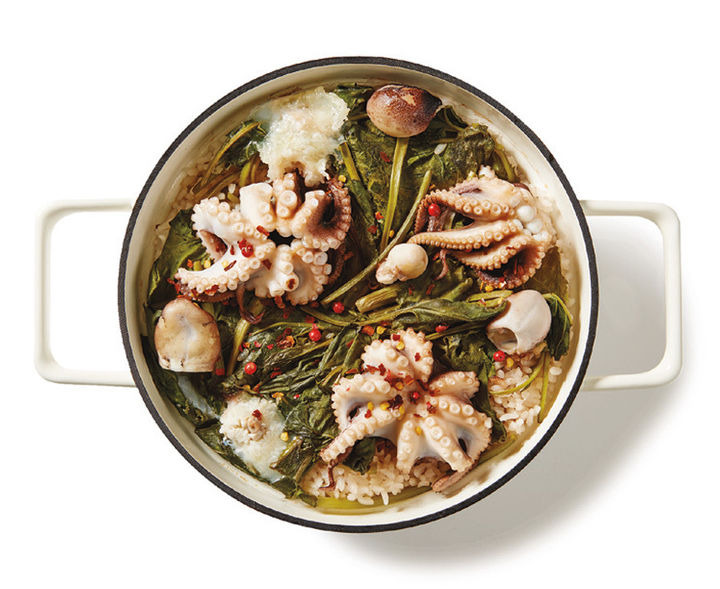 米2カップ、イイダコ3匹、シラヤマギクのナムル60g、水2カップ、昆布(10x10cm)1枚、酒大さじ1、塩小さじ1、胡椒少々