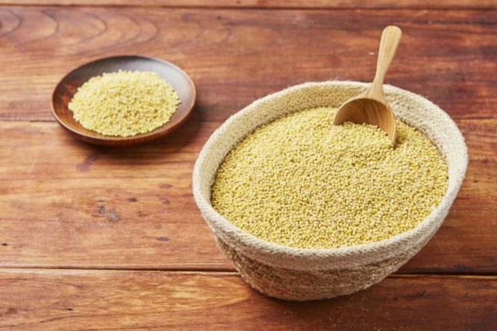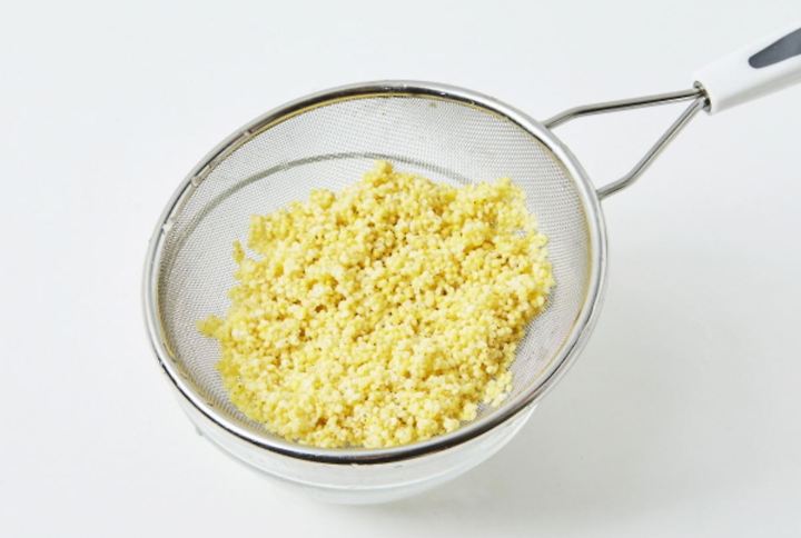 キビは、水に30分間つけ、鍋に水(3カップ)を入れて一緒に中火で10分間沸かした後、水気をとる。