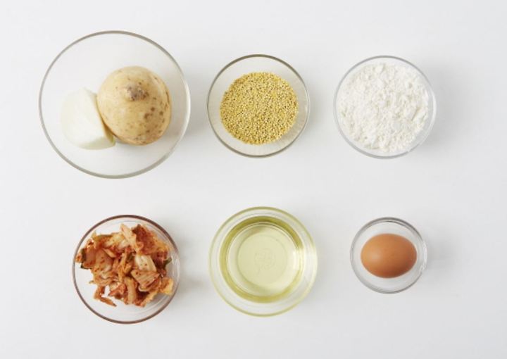 キビ(60g)、白菜キムチ(70g)、じゃがいも(1個)、チヂミ粉(大さじ4)、卵(1個)、タマネギ(40g)、サラダ油(大さじ6)