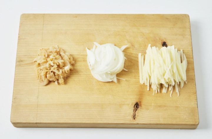 キムチを洗い水気をとった後、タマネギを細かく千切りにし、じゃがいもは皮を剥いて薄く千切りにする。
