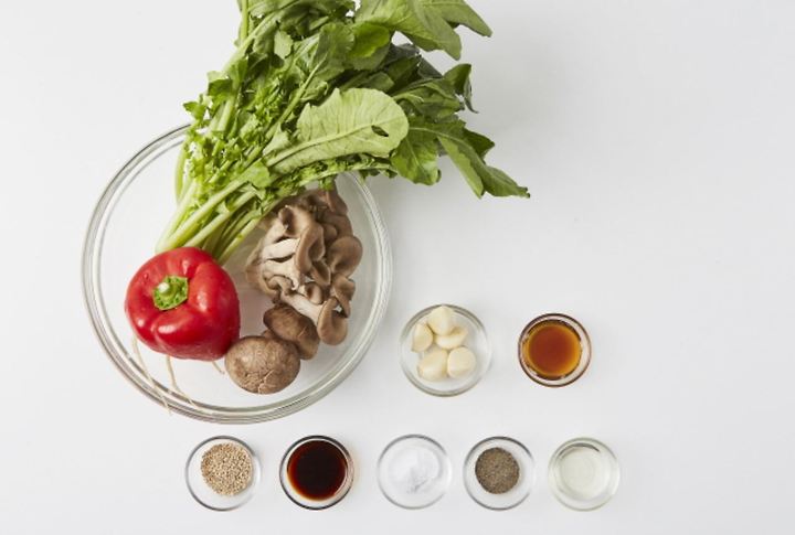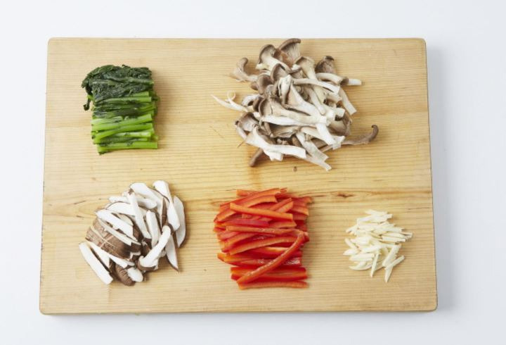 茹でた大根のまびき菜は5㎝の長さに切り、ヒラタケは根元を切り取り引き裂き、椎茸は根元を切り取り細かく切り、パプリカとニンニクは細長く切る。